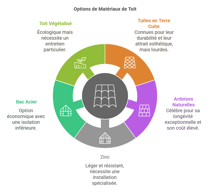 • Toit végétalisé : Écologique, mais nécessite un entretien particulier.